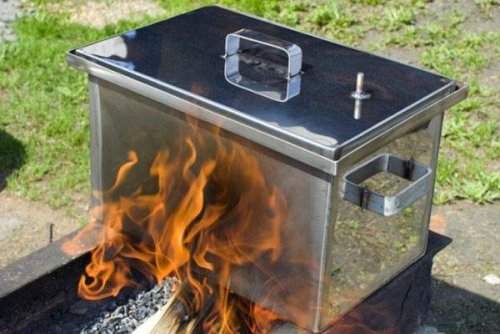 Более толстый металл делает конструкцию тяжелой, а тонкий – быстро ведёт от огня. Особенно если коптильня переносная.