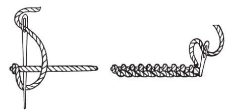 Сделать по изнаночной стороне прямой простой стежок и вывести иголку на лицевую сторону так, чтобы ее острие располагалось поверх рабочей нити, свернутой петлей. На противоположной стороне шва провести иглу под нитью, как показано на рисунке 16. При выполнении шва на его левой стороне образуются небольшие узелки, а на правой стороне – петли.