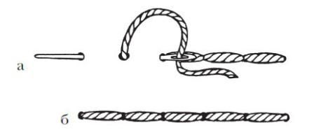 Выполняя 2-й стежок, уложить рабочую нитку слева направо, а иголку вколоть в место прокола, которым был закончен 1-й лицевой стежок. Снова провести иголку под тканью на изнаночной стороне и вывести на лицевую сторону на 3 мм левее 2-го стежка. Далее вновь ввести иголку в тот прокол, которым был закончен предыдущий стежок. С лицевой стороны это шов смотрится как сплошная строчка стежков, похожая на машинную строчку. Потому этот способ выполнения шва «за иголку» еще называют швом «строчка», или строчевым швом (рис. 2 а, б).